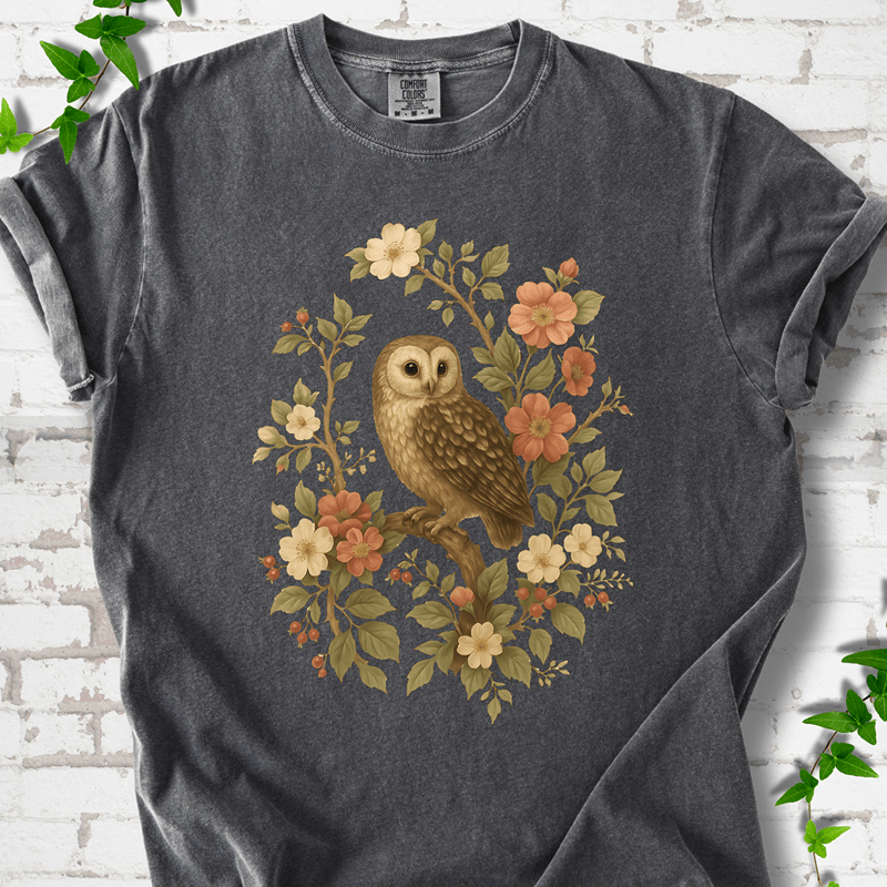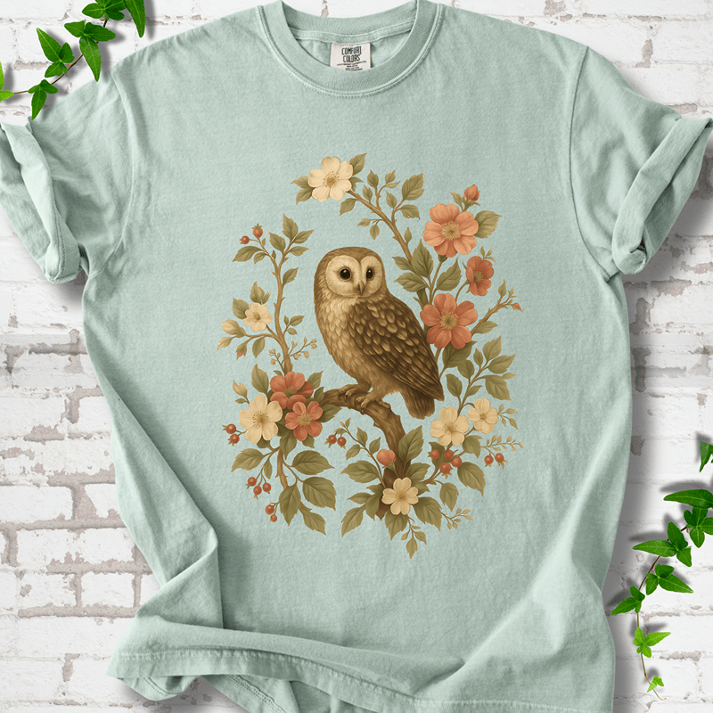Our Botanical Owl tee captures quiet woodland beauty in earthy tones and vintage style. Printed on 100% Comfort Colors™ cotton — perfect for nature walks, slow mornings, and gifting cottagecore lovers.